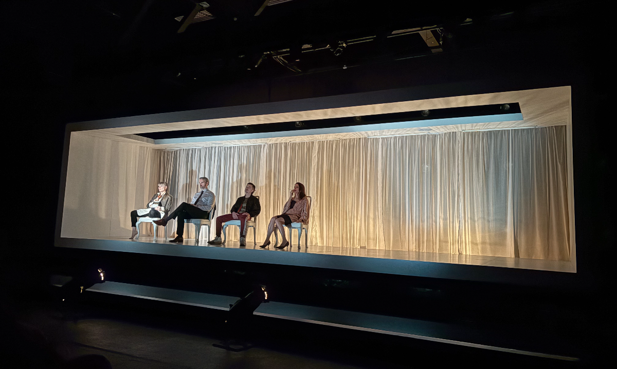 The play takes place within a literal box and a metaphorical state of mind. Zeyl envisioned the setting of the performance to represent a “purgatory of the psyche,” emphasizing the inner torment of the characters. Their dialogue unfolds simultaneously, intersecting with one another, yet each line carries profound individual experience–feelings of torture and anguish–confined by the limitations of the mind and the longing for love.