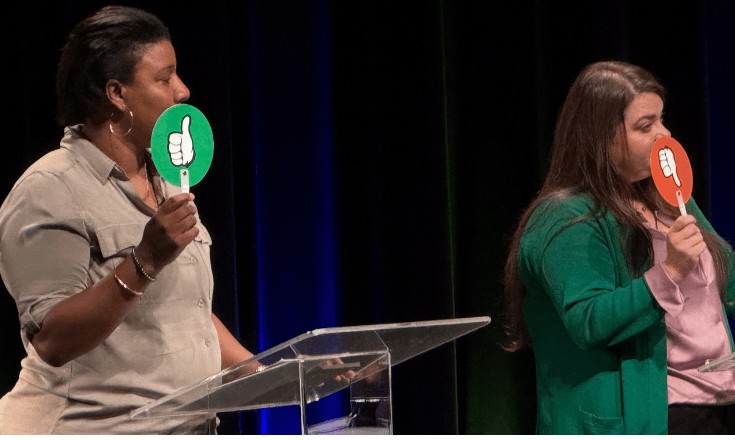 Juan Gonzales Candidates Hollingsworth (left) and Hudson (right) answering a round of “yes” or “no” questions