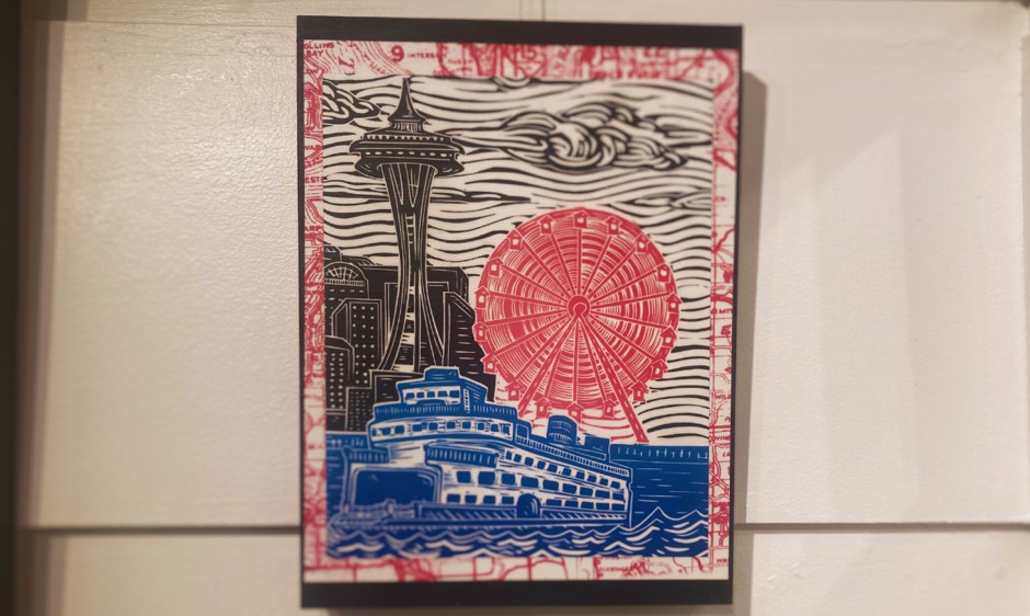 Other works, such as “Emerald City Goes Pink!” by Jigsaw Linocut, simply celebrate the color pink within the landscape of a city we all recognize. It features a warm-pink version of the ferris wheel by the pier, a ferry, and the city’s skyline behind the Space Needle.