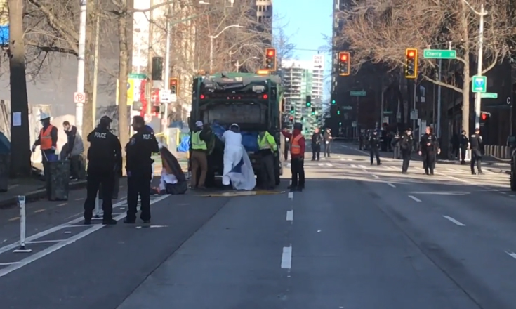 A row of tents lining two blocks of 4th Avenue in downtown Seattle was cleared by police and municipal workers in the early morning of Wednesday, March 9, despite opposition from anti-sweep activists.