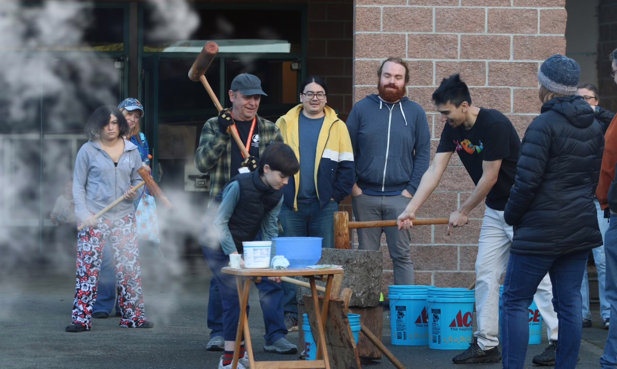 People from a wide range of communities and ages gathered around the usu outside the building. They were excited for their turn to pound mochi with locally crafted cherry wood mallets. “We allow the guests to pound as well, so they get the experience,” Nishimura added.