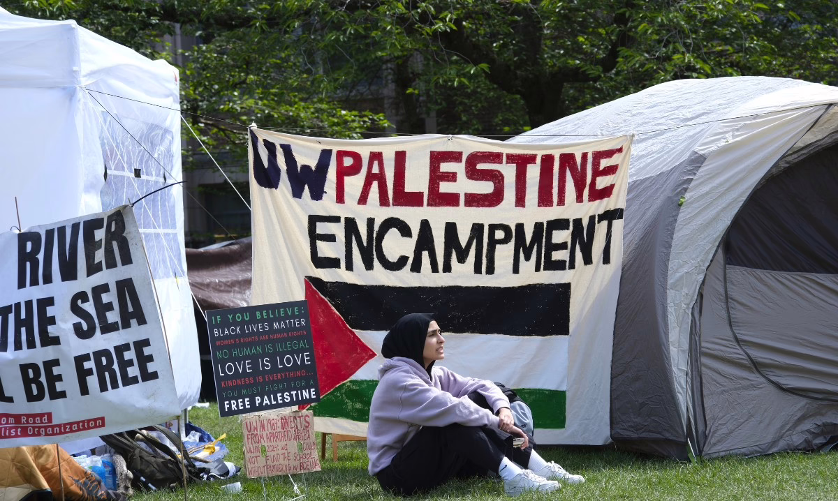 To protest the University of Washington’s ties with Israel and Boeing, students from the university’s Progressive Student Union (PSU), led by Mathieu Chabaud, started an encampment on the quad that they’re calling the “United Front Liberation Zone.” On Monday, April 29, students began setting up tents, posting signs, and offering free access to food and water.